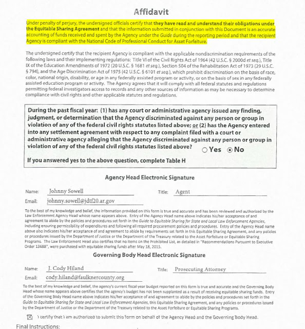 Seeing as how Hiland had to be taken to court to get the documents for the Federal Equitable Sharing account, we expect to have to file another lawsuit to obtain the documents for the ASP fund as well.