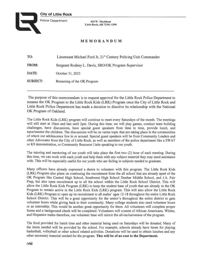 On September 12, 2023, Donald Northcross, the founder and CEO of the OK Program told the Little Rock Police Department that the OK Program of Little Rock operated by LRPD was being discontinued. Northcross also told LRPD they could not operate on any Little Rock School District campus as the OK Program.